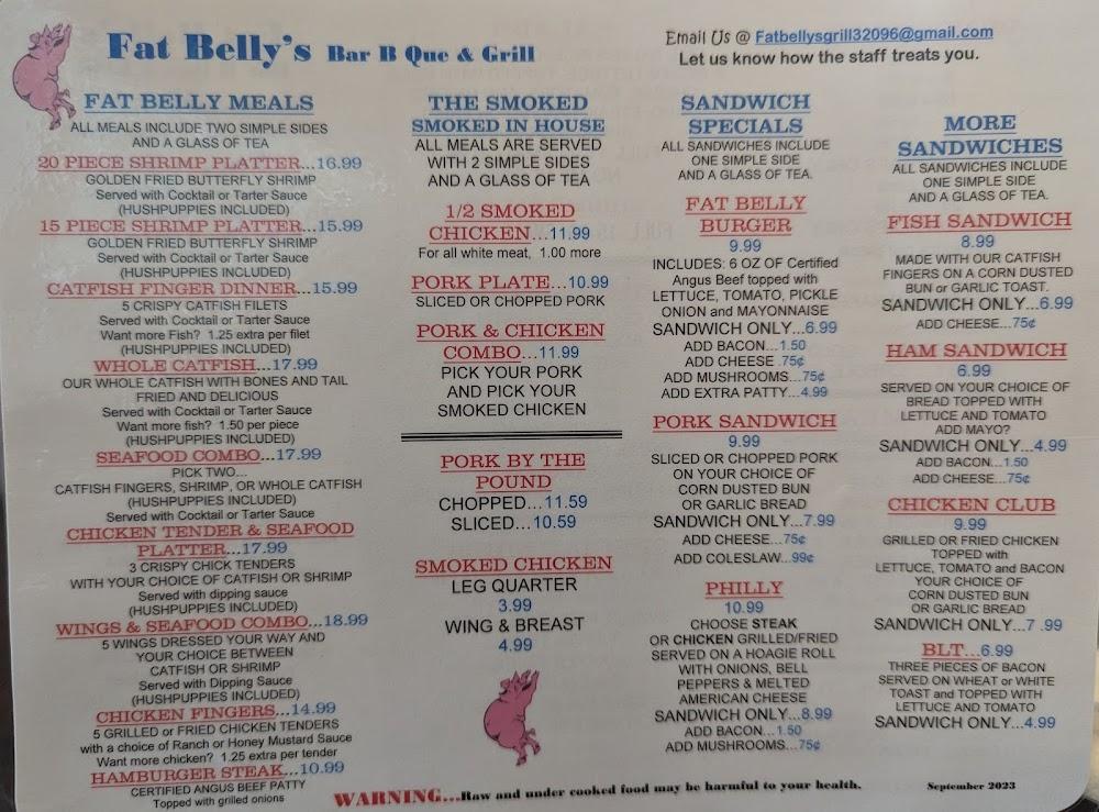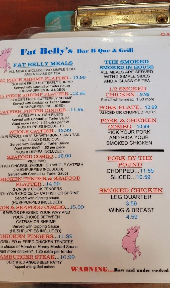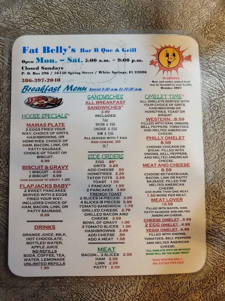 Welcome to Fat Belly's, your go-to destination for delicious grilled dishes and a cozy café experience in White Springs, FL. Located at 16750 Spring St, we offer a diverse menu featuring local specialties, perfect for breakfast, lunch, and dinner. Enjoy our excellent coffee and an array of teas in a relaxed atmosphere, ideal for solo dining or gatherings with friends and family. Our services include takeout, dine-in, and delivery, with convenient wheelchair accessibility. Whether you're here for a leisurely brunch or a quick bite, Fat Belly's promises exceptional taste and quick service. Join us today for an unforgettable meal!